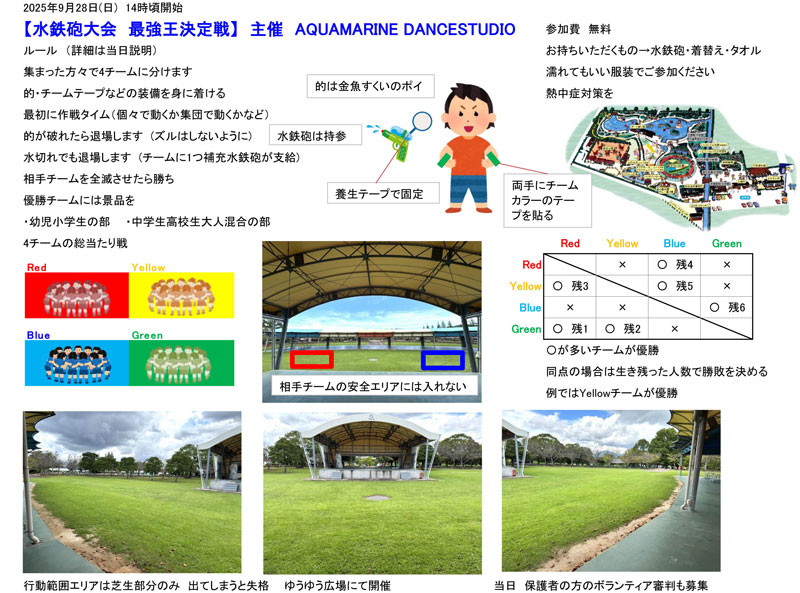 2025年9月5日 / 最終更新日時 : 2025年10月13日 干拓の里 イベント 水鉄砲大会!参加者募集!(9/28)※終了 Tweet Check Pocket 水鉄砲大会 最強王決定戦! ■開 催:9月28日(日) ■大会等の問い合わせ先は下記の案内へ! ■主 催:AQUAMARINE DANCESTUDIO ■問合せ先:dance2@aquamarine02.xsrv.jp (担当:平田)