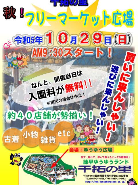 2023年9月10日 / 最終更新日時 : 2023年10月31日 干拓の里 イベント 秋のフリーマーケット広場!出店者募集(10/29)※終了 秋のフリーマーケット広場の出店者募集中!!終了 ●ゆうゆう広場で開催! ●募集枠数は、大型テント内の40枠です。 ■開催日:令和5年10月29日(日)※雨天中止 ■時 間:AM9:30~PM3:00 ※干拓の里はPM5: […]