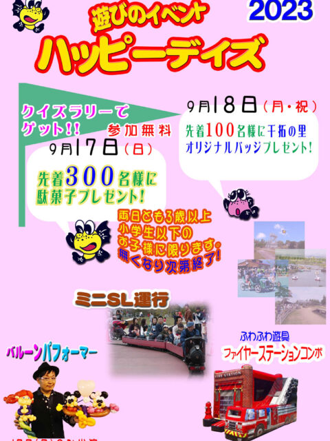 2023年9月16日 / 最終更新日時 : 2023年9月18日 干拓の里 イベント 遊びのイベント・ハッピーデイズ(9/17・9/18)※終了 干拓の里を満喫!一日楽しくお過ごし下さい!! ■開催日:9月17日(日)・9月18日(月・祝) ■ミニSL両日運行!※中止 10:00~16:30…2周300円※中止 ※追加日程・・・9月23日・24日運行!!(10月も […]