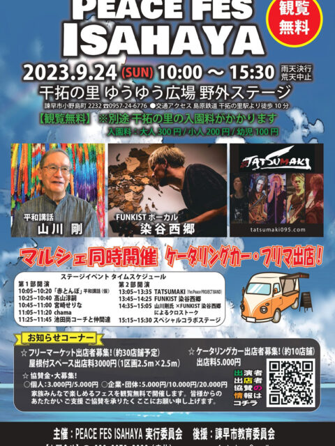 2023年9月16日 / 最終更新日時 : 2023年10月2日 干拓の里 イベント PEACE FES ISAHAYA~平和賛成~(9/24)※終了 ◆平和都市宣言する諫早から、新しい形の平和の祭典スタート!◆ 今、ロシア・ウクライナ戦争など、世界が混沌とする中、被爆地長崎だからできること。 平和都市を宣言する諫早市だから出来る事がある。 新しい形の平和の祭典は、平和 […]