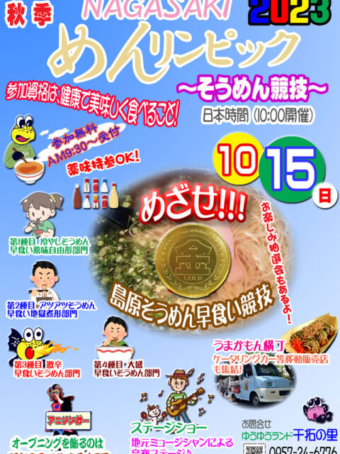 2023年10月1日 / 最終更新日時 : 2023年10月15日 干拓の里 イベント NAGASAKI 秋季!めんリンピック2023(10/15)※終了 NAGASAKI 2023 めんリンピック開催!! 今年も様々なスポーツのワールドカップが開催されましたが、干拓の里では2年に1回開催される「めんリンピック」がいよいよ10月開催されることになりました!競技は全て早食いの […]