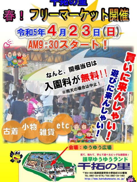 2023年4月5日 / 最終更新日時 : 2023年10月31日 干拓の里 イベント 春のフリーマーケット開催!(4/23)※終了 フリーマーケット出店者募集終了!! キャンセル待ち継続!! 2019年10月以来、4年ぶりに「ゆうゆう広場」で開催!ただし、大型テント内の40枠のみとなります。 ■開催日:令和5年4月23日(日)※雨天中止 ■時 間:A […]