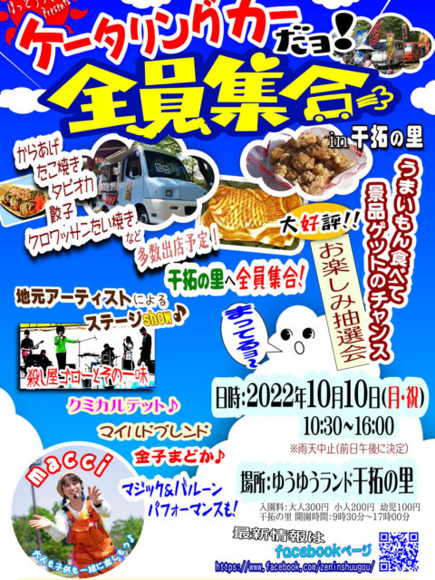2022年9月30日 / 最終更新日時 : 2022年10月12日 干拓の里 イベント 秋のケータリングカーだヨ!全員集合!(10/10) ※終了 たこ焼き、ホットドッグ、鶏のから揚げ、焼きそば、パン、コーヒーなど美味しいケータリングカーが干拓の里ゆうゆう広場に大集合!ステージでは、地元アーティストの演奏やアラフォー・アラフィフに人気のアニソンガーが登場(^^) 日 […]