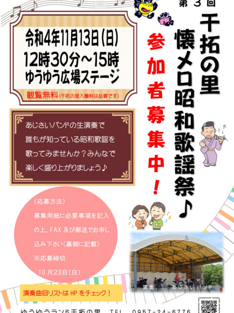 2022年10月10日 / 最終更新日時 : 2022年10月19日 干拓の里 イベント 【延期】干拓の里 懐メロ昭和歌謡祭♪ 「干拓の里 懐メロ昭和歌謡祭」延期のお知らせ 11月13日(日)に開催を予定しておりました「干拓の里懐メロ昭和歌謡祭」につきまして、諸事情により延期することとなりました。深くお詫びを申し上げます。楽しみにされていた皆様に […]