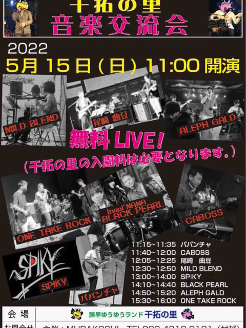2022年5月5日 / 最終更新日時 : 2022年11月9日 干拓の里 イベント 干拓の里♪音楽交流会(5/15)※終了 干拓の里♪音楽交流会 ♪楽しいひと時を音楽で楽しみましょう♪ 開 催:令和4年5月15日日曜日) 時 間:AM11:00~ 観 覧:観覧無料(※入園料は必要です) 会 場:ゆうゆう広場 ※出演者(下記チラシをご参照くださ […]