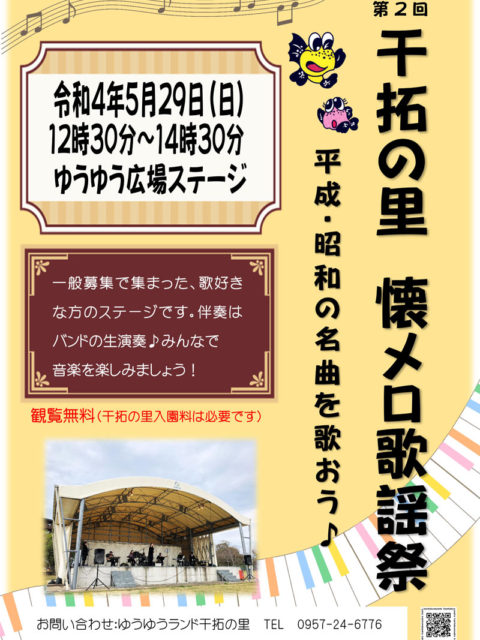 2022年5月15日 / 最終更新日時 : 2022年11月9日 干拓の里 イベント 干拓の里 懐メロ歌謡祭~平成・昭和の名曲を歌おう♪(5/29)※終了 🎶干拓の里の大きなステージで歌ってみませんか?🎵 明日は、予定通り開催いたします。 昭和や平成時代の懐かしい名曲を歌ってくれる方を募集しております。 バンドの生演奏をバックに楽しく歌って歌 […]