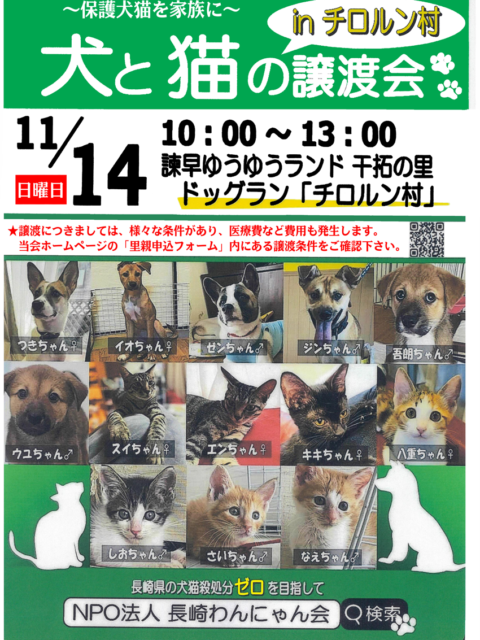 2021年11月9日 / 最終更新日時 : 2021年11月15日 干拓の里 イベント 犬と猫の譲渡会 in チロルン村(11/14)※終了 ~保護犬猫を家族に~ 犬と猫の譲渡会 in チロルン村 開催日:令和3年11月14日(日) 時 間:10:00~13:00 会 場:干拓の里駐車場内「ドッグラン/チロルン村」(※地図GoogleMap) お問い合わせ:0 […]