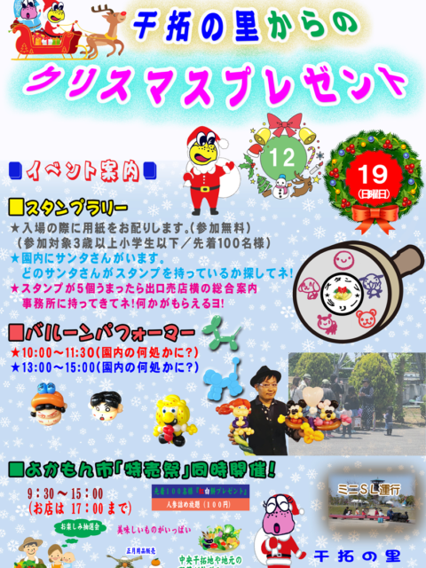 2021年12月19日 / 最終更新日時 : 2022年11月9日 干拓の里 イベント 干拓の里からのクリスマスプレゼント(12/19)※終了 ★干拓の里からのクリスマスプレゼント★ ■開催日:12月19日(日)■ ◆スタンプラリー◆ 先着100名様(対象:3歳以上小学生以下) 入場門にて、参加希望の対象者の方に用紙をお渡しします。 スタンプ用紙が5個うまったら […]