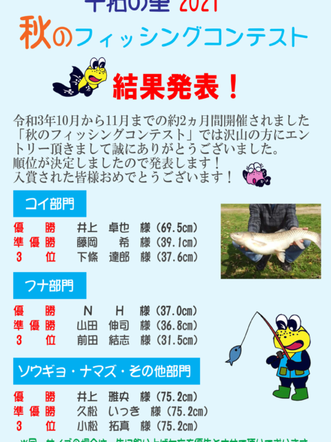 2021年12月1日 / 最終更新日時 : 2021年12月2日 干拓の里 イベント 秋!干拓の里フィッシングコンテスト結果発表 秋のフィッシングコンテストを10/1~11/30までの2ヶ月間開催致しましたが、たくさんの方々にご参加いただき誠にありがとうございました。つきましては、コンテストの結果が確定しましたので発表いたします!また、来年の春に開 […]
