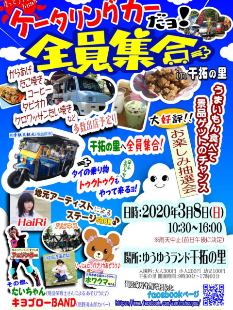 2020年2月26日 / 最終更新日時 : 2020年2月26日 干拓の里 イベント 春!ケータリングカーだよ!全員集合!(3/8)※中止 2月25日の政府発表の”新型ウイルス対策基本方針”を考慮し、3月8日(日)に開催を予定しておりました「ケータリングカーだヨ!全員集合in干拓の里」につきましては、感染拡大防止の観点より、中止をさせていただく運びとなりまし […]