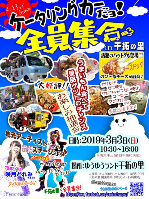 2019年2月22日 / 最終更新日時 : 2019年3月3日 干拓の里 イベント 春のケータリングカーだよ!全員集合!※雨天中止(3/3) 本日の「春のケータリングカーだよ!全員集合!」は雨天のため中止となりました。 たこ焼き、ホットドッグ、鶏のから揚げ、焼きそば、パン、コーヒーなど美味しいケータリングカーが干拓の里ゆうゆう広場に大集合!ステージでは、地元ア […]
