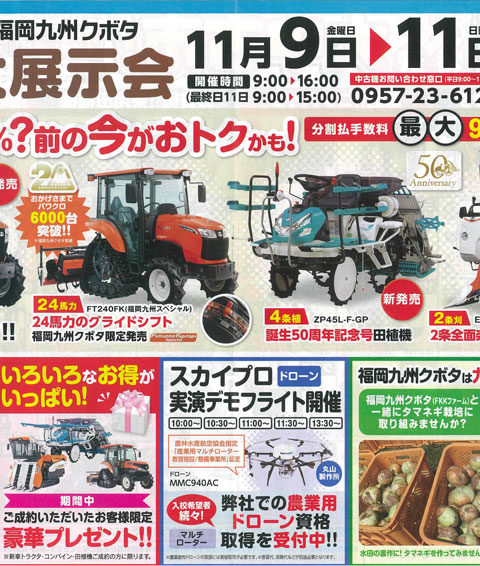 2018年10月24日 / 最終更新日時 : 2018年11月12日 干拓の里 イベント 福岡九州クボタ秋の大展示会(11/9~11/11)※終了 福岡九州クボタ秋の大展示会 開催日:平成30年11月9日(金)~11日(日)の3日間 時 間:AM9:00~PM4:00 入園料:無料(上記期間3日間)※園内水族館や遊具等は通常料金です。 【中古市同時開催】 早い者勝ち […]