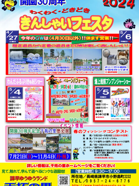 2024年4月10日 / 最終更新日時 : 2024年5月19日 干拓の里 イベント きんしゃいフェスタ2024開催(4/27~5/6)※終了 ☀ゴールデンウィークは干拓の里へLet’s go!!🌞 ★★★お待たせしました★★★ 干拓の里にみんなのヒーローが帰って来る!!! キャラクターショーの当日は、皆の力で青空に!! ■5月4日 […]