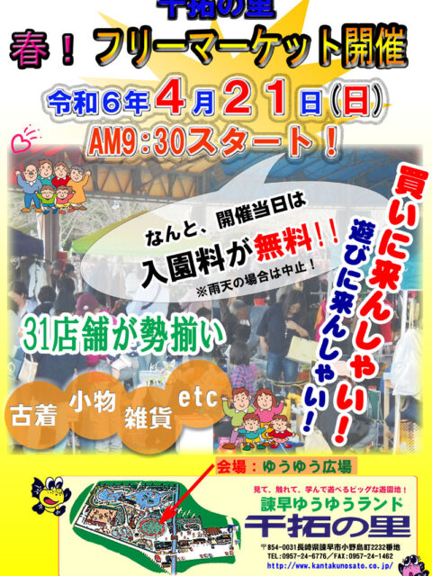 2024年4月10日 / 最終更新日時 : 2024年7月24日 干拓の里 イベント 春のフリーマーケット広場! (4/21)※雨天中止 本日開催予定のフリーマーケットは雨天のため、中止と致します。 次回は秋となります。 キャンセル待ちご希望の方は、下記の申込書をダウンロードしてから提出して下さい。 ●ゆうゆう広場で開催! ●募集枠数は、大型テント内の40 […]